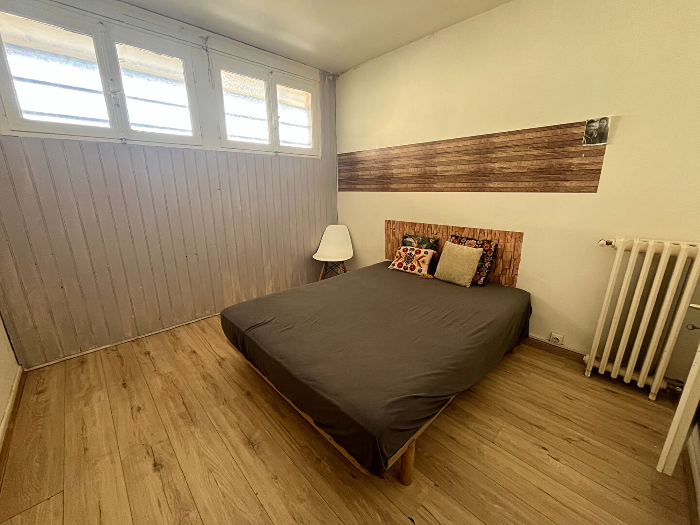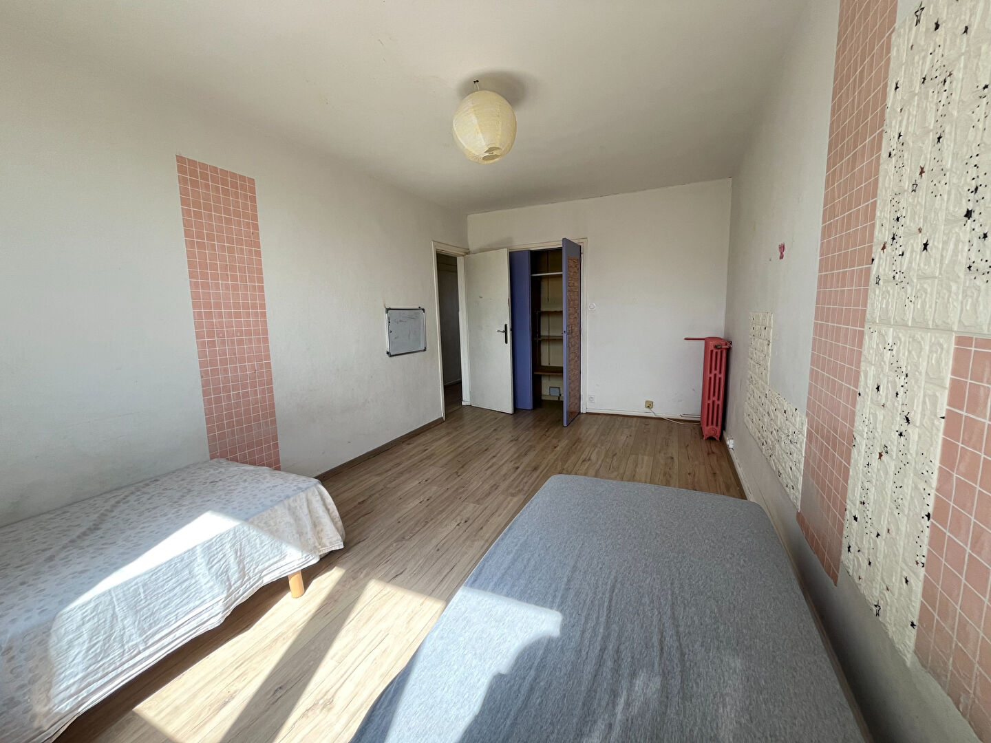 Ce T3 est composé d’un séjour avec cuisine, d’une grande chambre de 15 m2 et d’une deuxième chambre d’environ 11 m2, d’une salle d’eau avec wc et d’une loggia (balcon fermé)